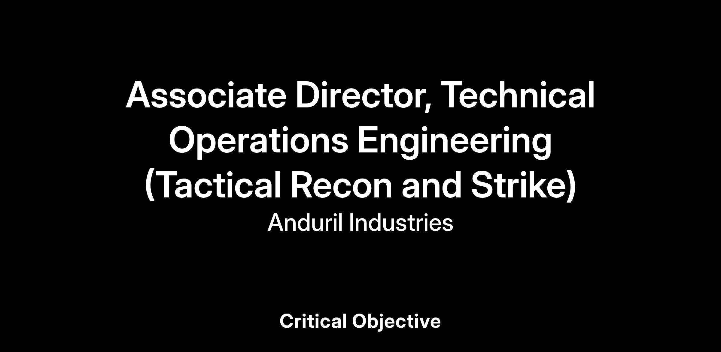 The Tactical Recon & Strike (TRS) team at Anduril develops small aerial drones (Group 1-3) along with all the necessary equipment for testing, deployment, and operation. The team transforms products like Ghost, Anvil, Altius, and Bolt from initial concepts into operational systems. We work closely with specialized teams to tackle some of our customers' most complex challenges. Currently, we are seeking a technical field operations team lead to support hardware engineers, roboticists, and front-end mobile developers who are passionate about creating a robust robotics platform that can be tasked and monitored in real time through various interfaces.