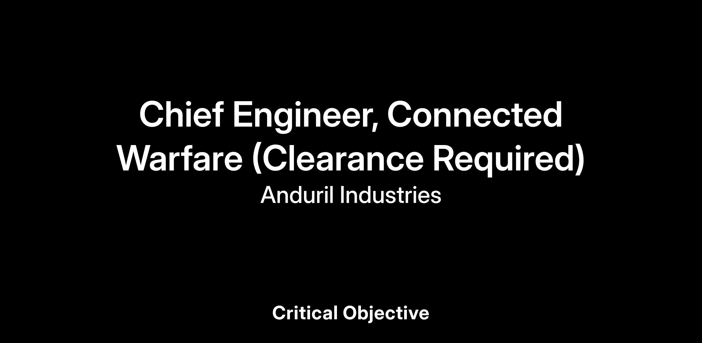 Anduril’s Connected Warfare team is seeking a Chief Engineer to join our team supporting Mission Command. The Mission Command area focuses on how Anduril’s Lattice software runs across the far edge to interconnect both Anduril and other systems to provide the ability to share data and task assets across the globe.