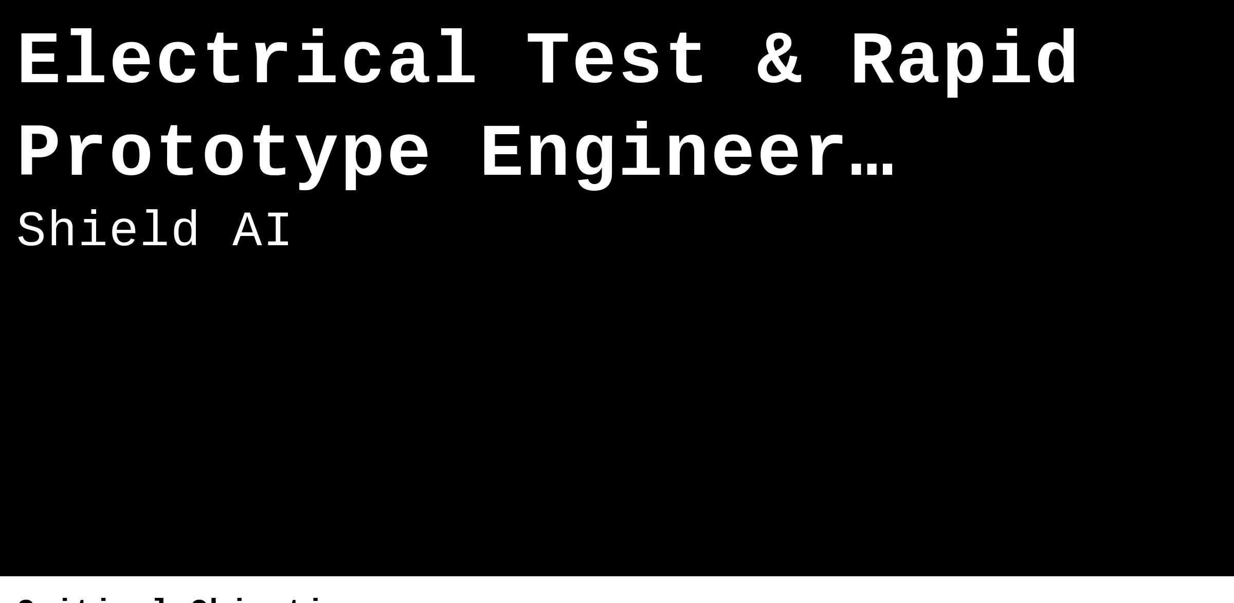 At Shield AI, we are revolutionizing defense technology to protect service members and civilians with intelligent, autonomous systems. Our Hardware Test Engineering team plays a critical role in ensuring the V-BAT remains the most reliable, mission-ready UAV in the industry. We design cutting-edge test solutions—custom-built electrical and mechanical systems that push our hardware to its limits in real-world and extreme environments.