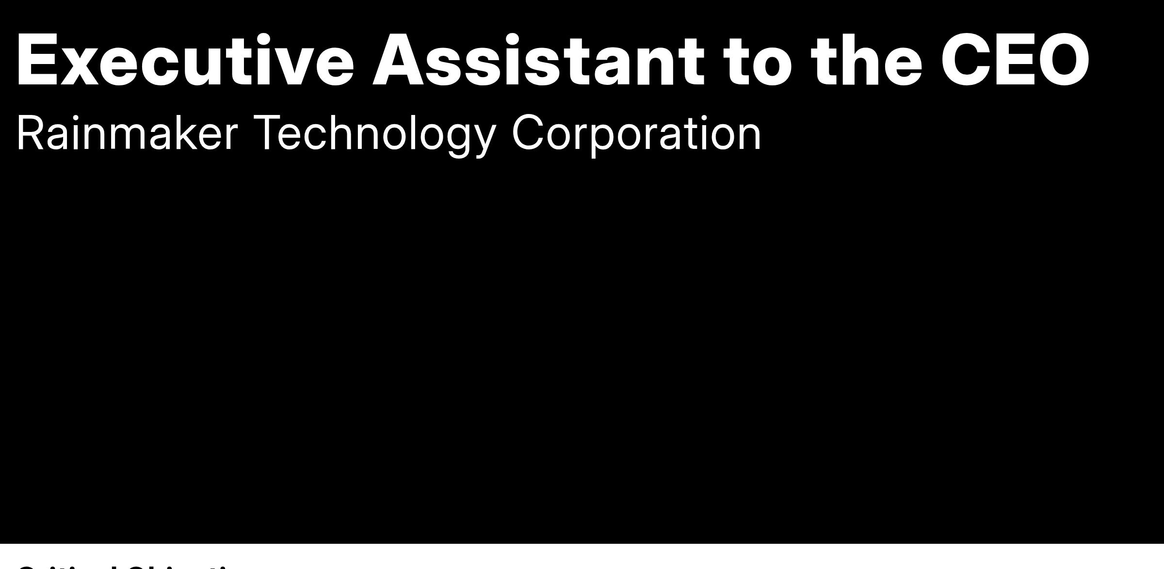 Rainmaker Technology Corporation, a leader in innovative cloud seeding solutions, is seeking a dedicated and proactive Executive Assistant to support the CEO. This role requires exceptional organizational skills, flexibility, and the ability to thrive in a fast-paced, dynamic environment.