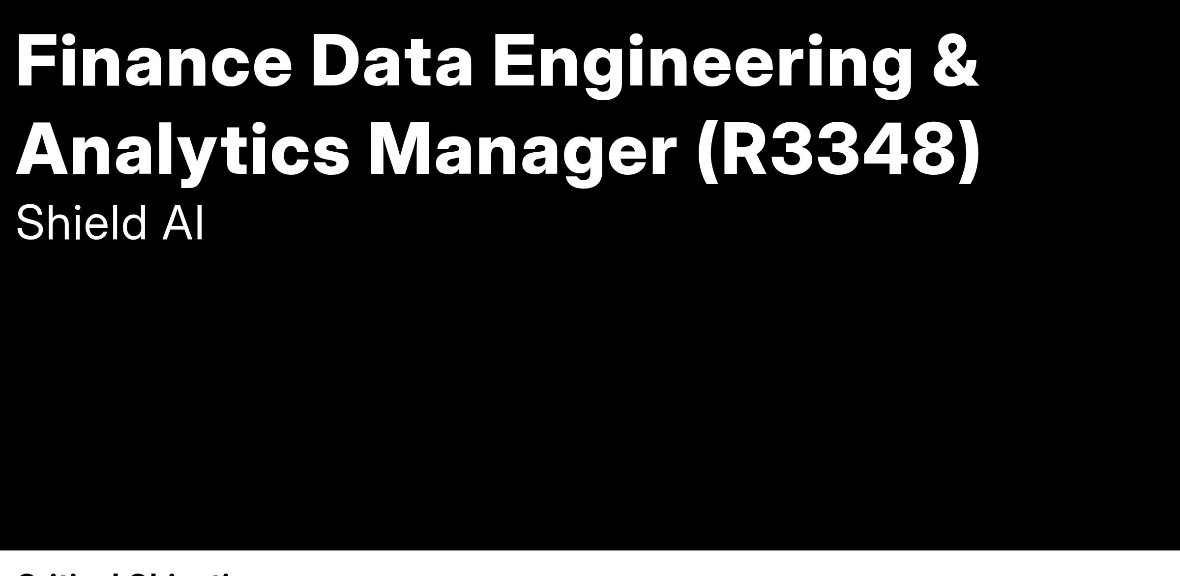 Shield AI is seeking a Finance Data Engineering & Analytics Manager to join our Finance team. This pivotal role will drive the scaling of our data-driven decision-making processes, providing real-time insights that shape key financial and operational strategies. You will leverage advanced analytics, visualization tools, and financial modeling techniques to support strategic initiatives and enhance performance optimization.