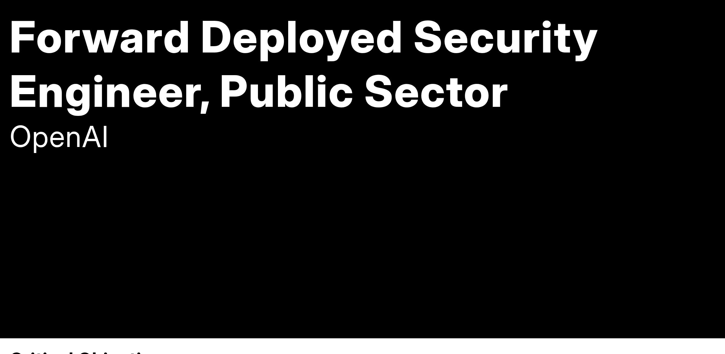 Our technologies support some of the most important and impactful work in the world, including our strategic and high-impact customers in the public sector. As a Forward Deployed Security Engineer (FDSecE) you will be responsible for securing these novel applications of OpenAI’s technology. We’re looking for motivated, tenacious, and curious people who will work closely with engineering teams to ensure our infrastructure deployments are highly secure against our adversaries.