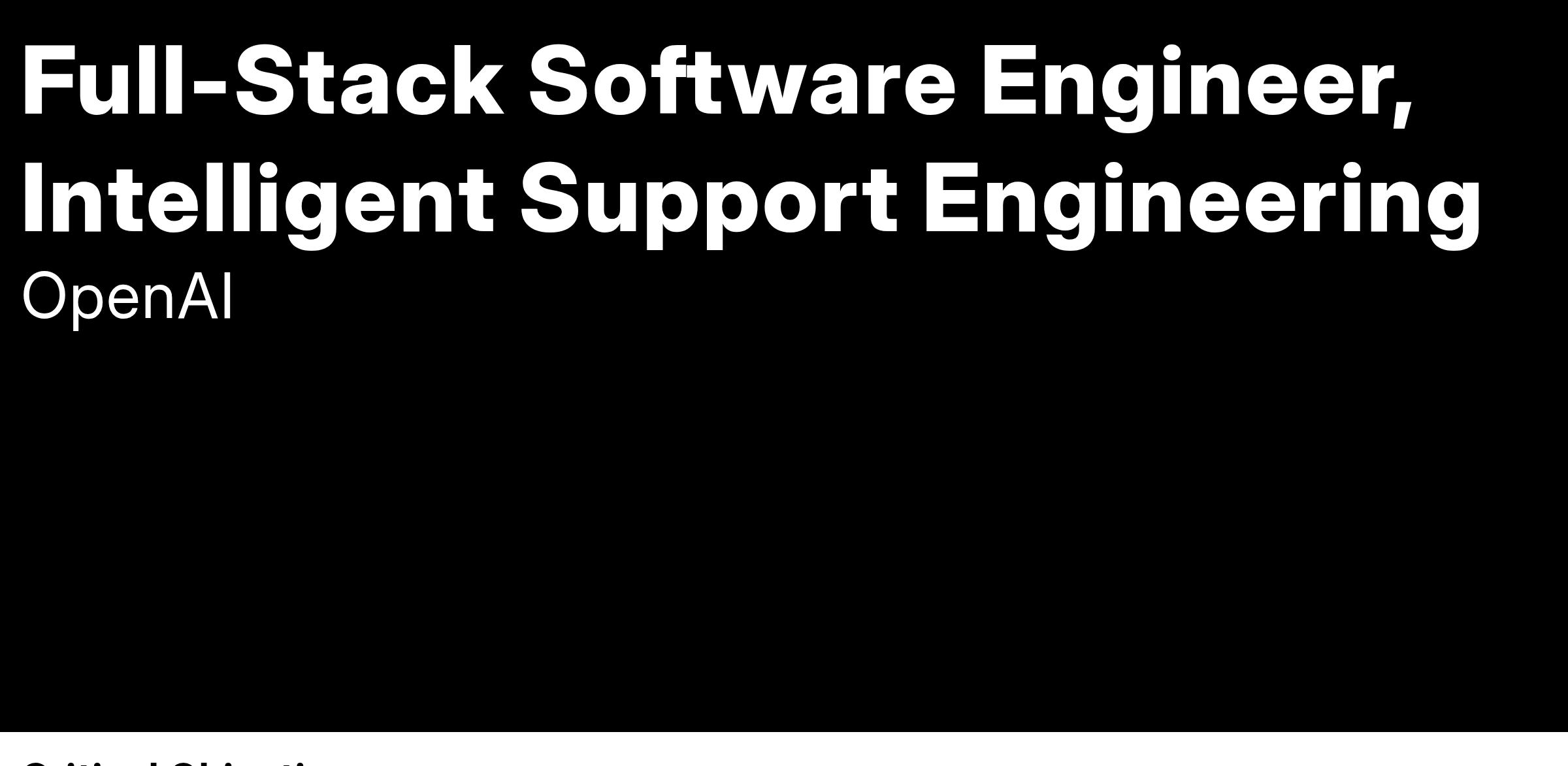 The Intelligent Support Engineering team is scaling OpenAI with OpenAI. We apply our latest models, technologies, and products (some external, some still in the lab) to real-world problems in order to assist with or automate work across the User Operations organization. We share what we learn back to the broader product and research teams, and we look to scale our solutions to new problem spaces within OpenAI. We love building products for folks sitting right next to us, and we take the time to add the touches that delight. Our goal is to prototype fast, then build for reliable long-term impact. We're constantly looking for the similarities and patterns in different types of work, and focus on building simple, generic patterns that we can apply across many domains.