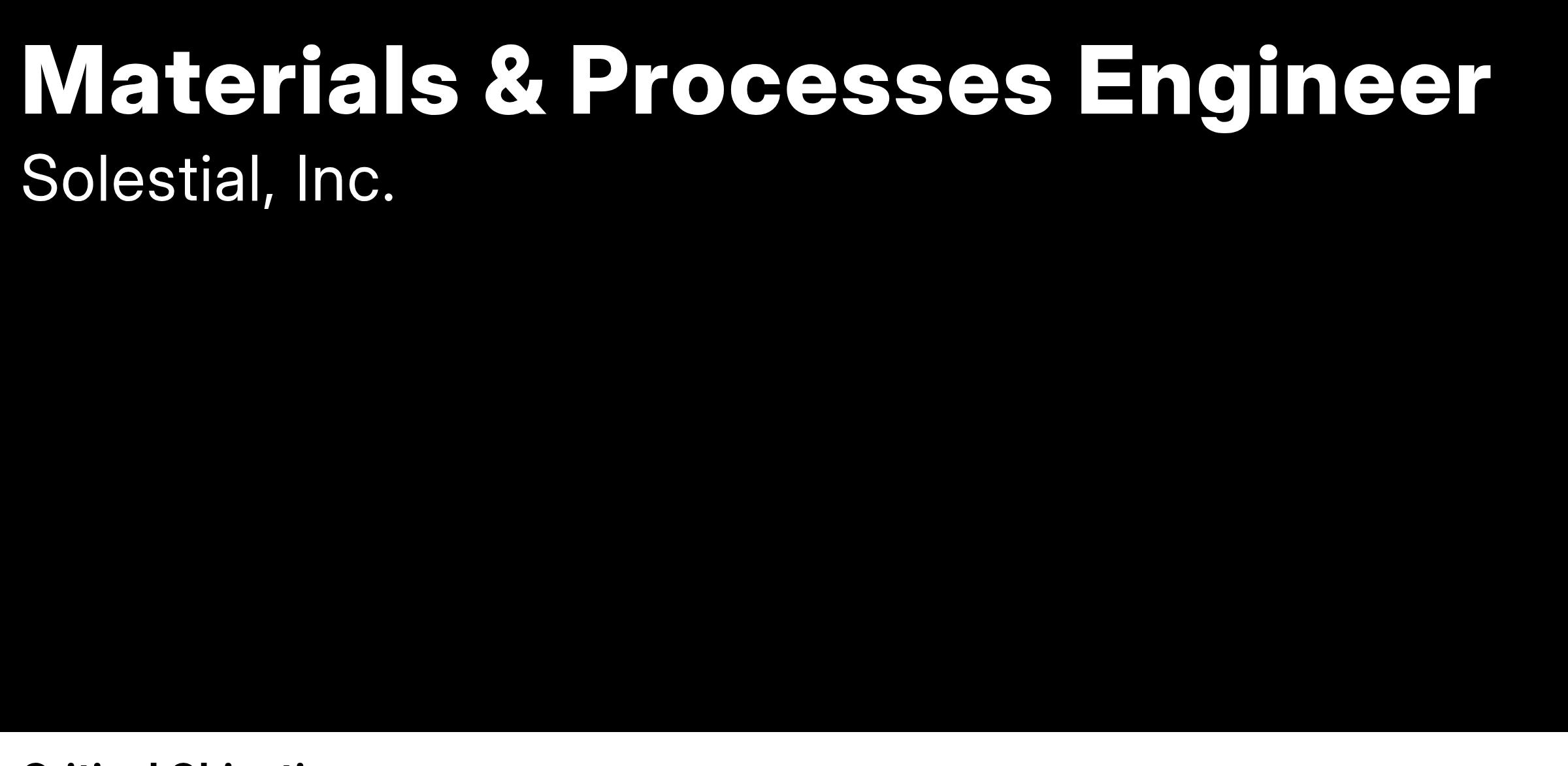 As the Materials & Processes Engineer you will be at the forefront of Solestial manufacturing development methods. You will work independently and demonstrate expertise in developing and implementing materials and processes solutions to ensure the successful implementation and performance of Solestial’s solar modules.