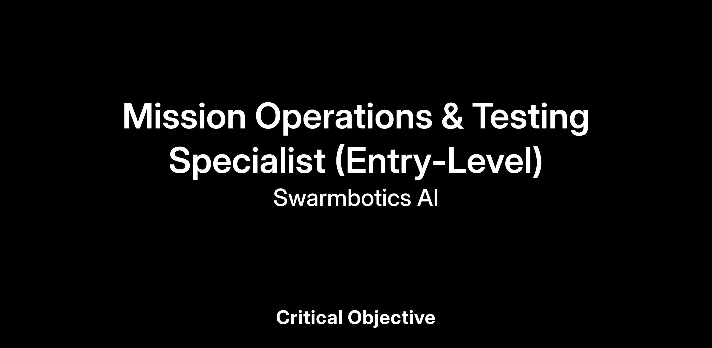 Swarmbotics is seeking an entry-level Mission Operations & Testing Specialist to support both daily testing of our autonomous ground systems and live field demonstrations for Department of War (DoW) customers. This hybrid role combines hands-on robot testing, technical field operations, and customer-facing mission support. You will help ensure our robots are reliable, safe, and ready for real-world missions while representing the company during high-visibility demonstrations, exercises, and field events.