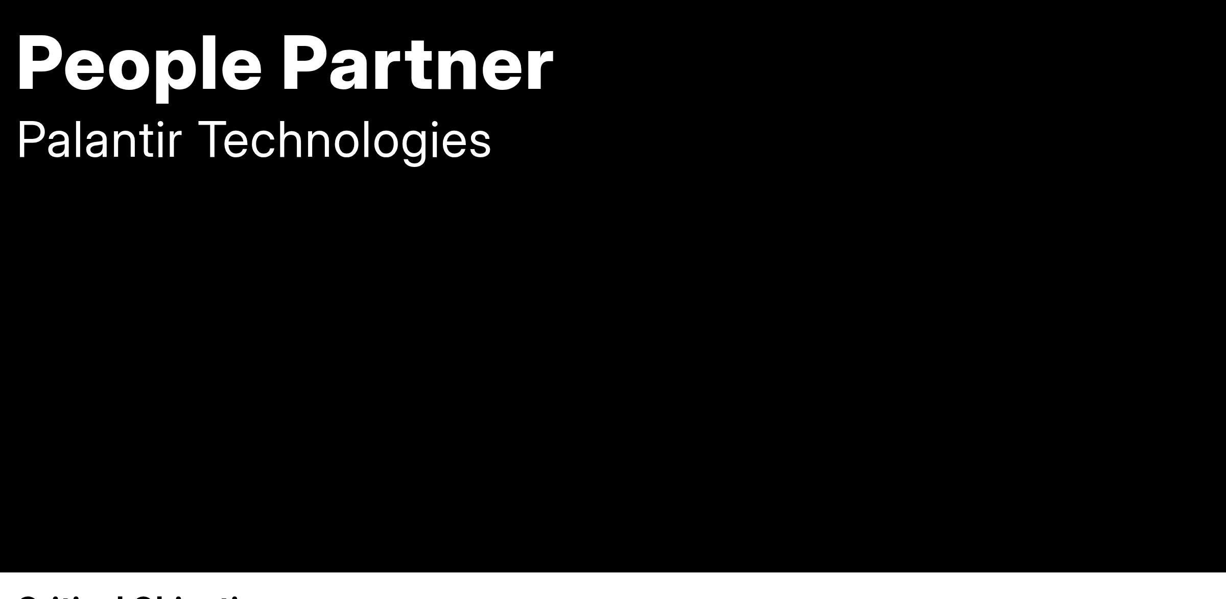 The People Partner team is dedicated to driving business outcomes by cultivating a highly effective and engaged workforce in partnership with key business leaders. We work closely with all teams and at all levels to improve talent development, manage performance, and facilitate feedback across the organization. We help empower Palantirians to be as effective and impactful as possible.