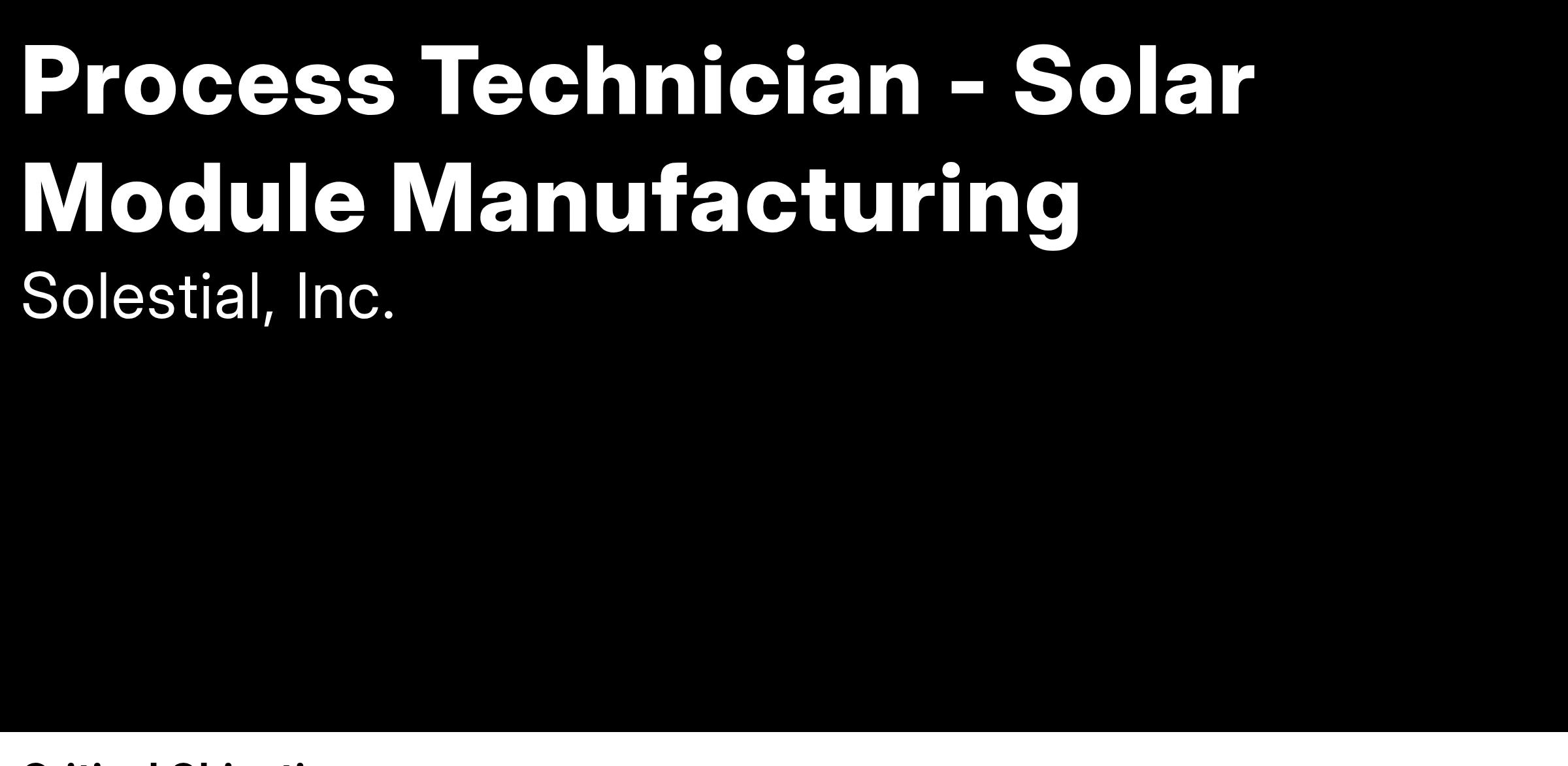 As a Process Technician at Solestial you will be responsible for building solar modules according to baseline processes. This will include both manual and automated processes, which would require safely operating solar module equipment at the Solestial R&D line. You will also assist engineers in transitioning solar module manufacturing processes to a new mass production line. For our large-scale manufacturing line, technicians will be performing operational preventative maintenance on the equipment, diagnosing and troubleshooting intermediate-level alarms, running basic quality control procedures, and working with simple hand tools and systems during floor operations.