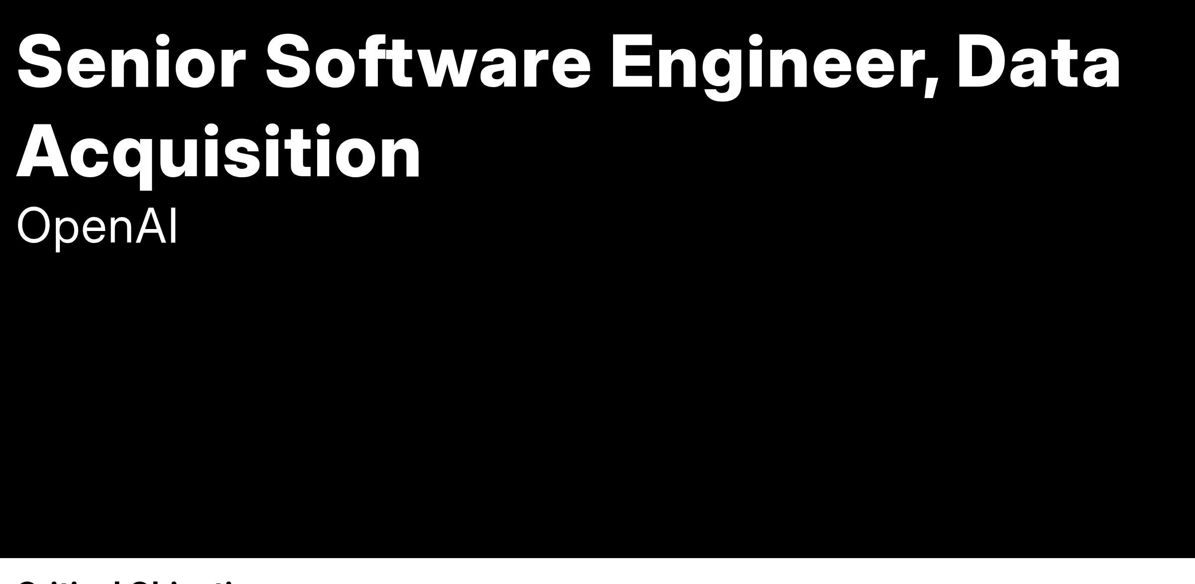 The Data Acquisition team within the Foundations organization at OpenAI is responsible for all aspects of data collection to support our model training operations. Our team manages web crawling and GPTBot services and works closely with Data Processing, Architecture, and Scaling teams. We are looking for a skilled Senior Software Engineer to join our Data Acquisition team.