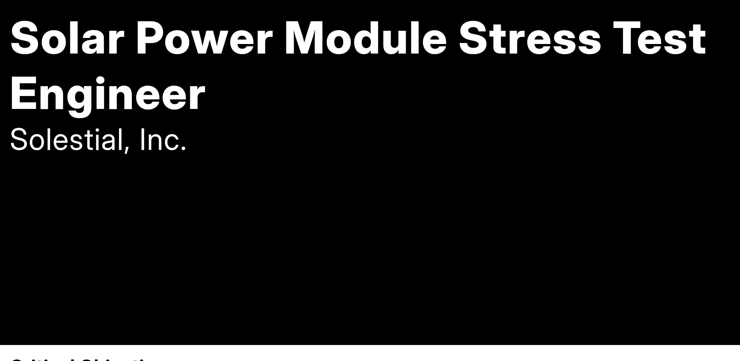 - Manage Solestial’s test equipment and ensure it is properly maintained to support all tests.