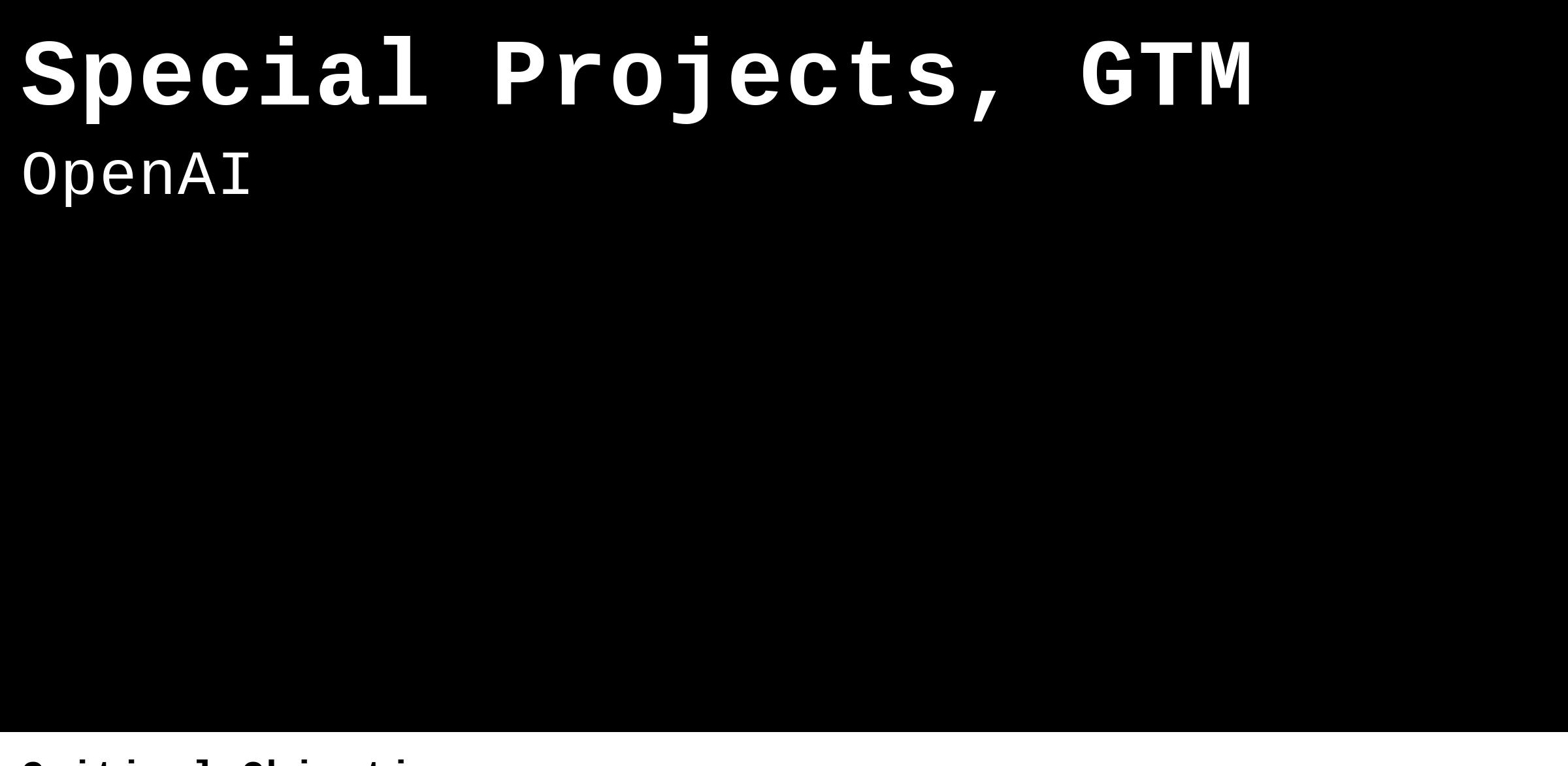 We’re hiring for Special Projects Lead, GTM — a strategic, high-ownership role for exceptional operators who can bring clarity, momentum, and results to OpenAI’s most important commercial initiatives. You’ll be a utility player across top GTM programs, with direct ownership of 1–2 high-impact projects at any given time. Examples include developing the GTM operating cadence, partnering to create a new business unit, and driving quarterly/annual planning.