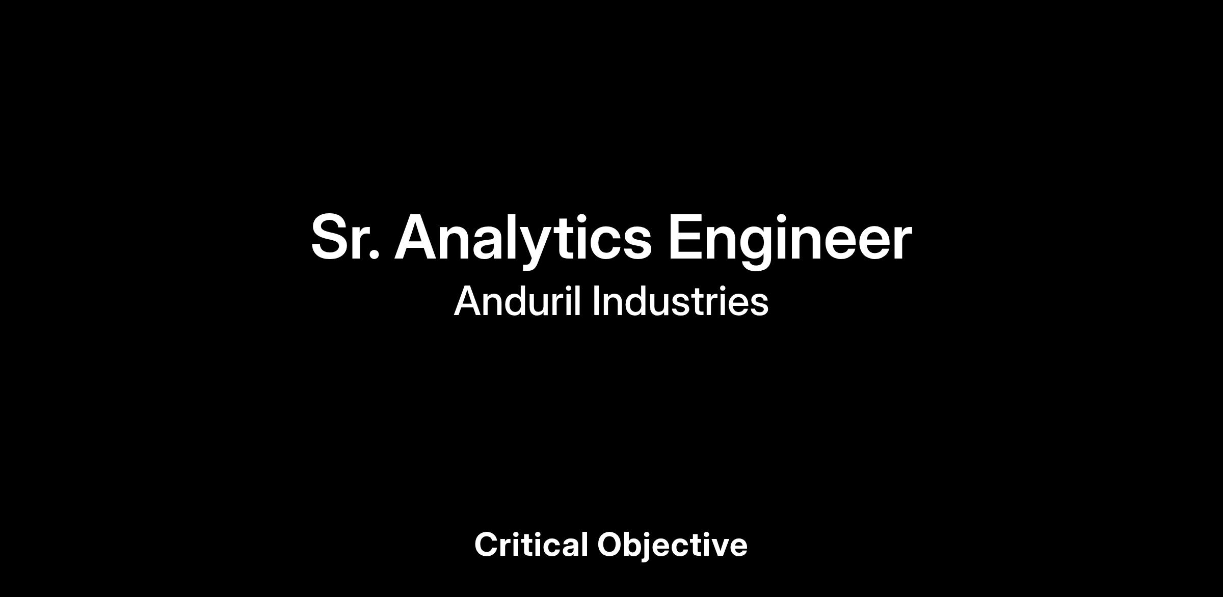 The Analytics team is responsible for modeling our internal data into reusable entities that generalize how Anduril operates. From those entities we build workflows, dashboards, and metrics that drive better and faster decision-making. You will work with stakeholders from across the company to understand how Anduril functions and model our data to create the digital twin of our operations. The Analytics space is engrained in our team’s DNA, as we regularly discuss shifts in the industry and keep up with the top relevant blogs. If this culture and Anduril’s mission speaks to you, you’ve found the right place.