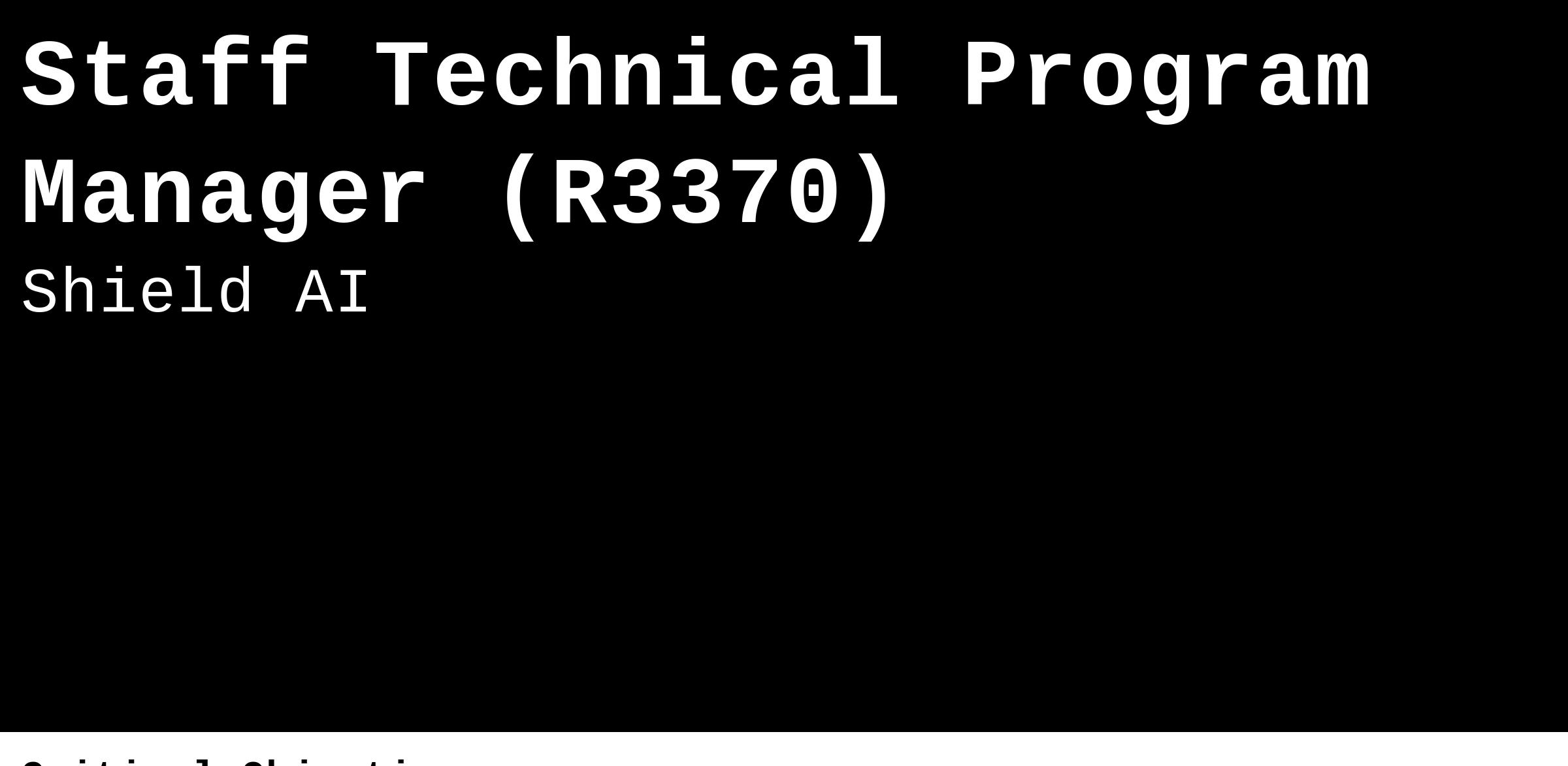- Reinforce Shield AI's reputation for technical excellence and ability to deliver through expert engagement and disciplined execution.